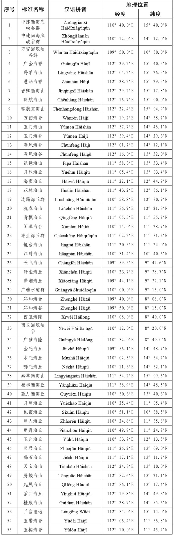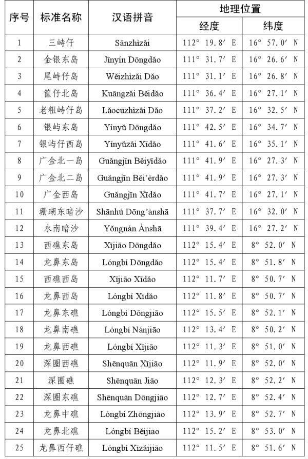 公告称,为进一步规范有关地名的使用,现将我国南海部分岛礁和海底地理实体的标准名称予以公布。中国地名委员会1983年4月受权公布的《我国南海诸岛部分标准地名》继续有效,请社会各界规范使用已公布的标准名称。