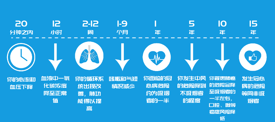 戒烟后20分钟内,增高的心率和血压就会下降。12小时后,血液中的一氧化碳浓度降至正常。在2-12周内,循环系统出现改善,肺功能得以提高。1-9个月后,咳嗽和气短症状会有减轻。