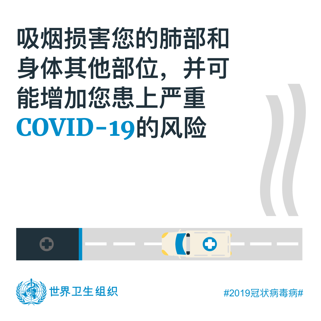 2019冠状病毒病是一种主要侵袭肺部的传染病。吸烟造成肺功能损害,使人与体更难抵抗冠状病毒和其他疾病。烟草还是心血管疾病、癌症、呼吸系统疾病和糖尿病等非传染性疾病的主要风险因素,当受到2019冠状病毒病影响时,已存在这类疾病的人罹患重病的风险更高。现有研究表明,吸烟者发展为重症和出现死亡的风险更高。