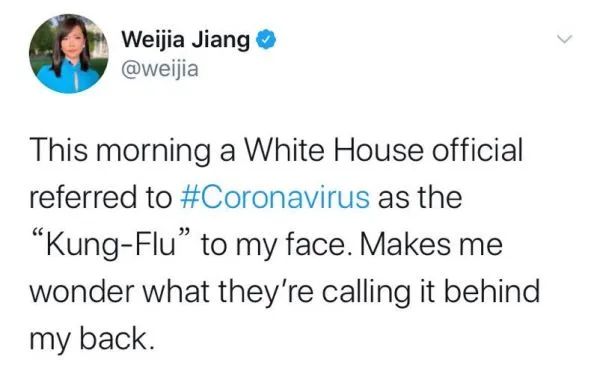 而Weijia Jiang本人则在3月17日的推特中透露,有白宫官员曾当着她的面称病毒为“功夫流感”。